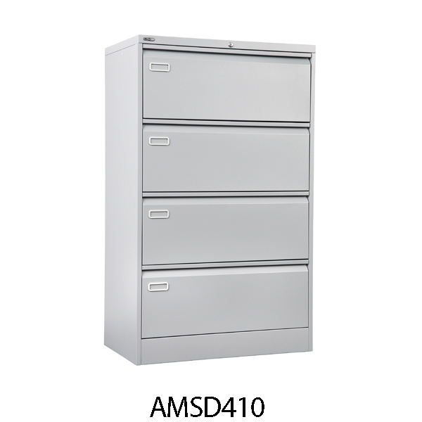 4 drawer steel side filing cabinet with a swan neck grip handle, locking