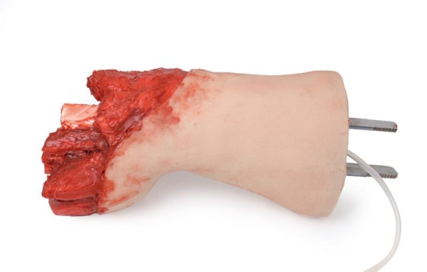 The trainer represents a traumatic amputation. The bleeding system enables the arm to bleed realistically from the wounds.