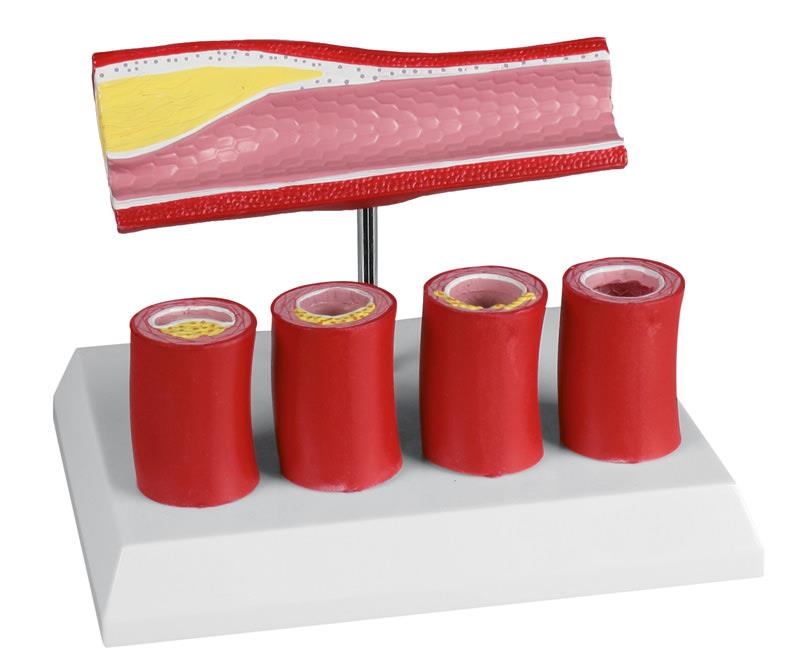 Longitudinal section of an artery with constriction caused by plaque adsorption. Four cross sections on the base show step-by-step build-up of plaque at the artery wall.