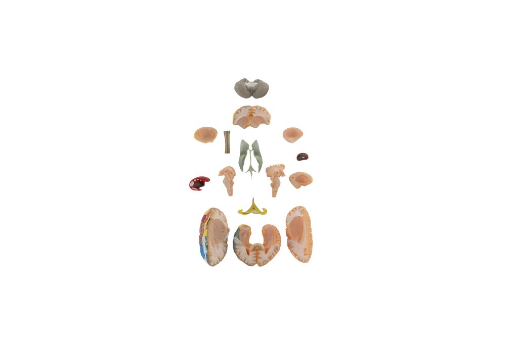 This life-sized model is crafted from specialized plastic. Brodmann areas can be seen on the model, and it can be disassembled into 15 parts as follows: cerebral hemispheres (2 pcs), temporal and occipital lobes with the limbic system, cerebellum, frontal lobe, corpus callosum, brain stem (2), insula (2), corpus striatum, left lentiform nucleus, right internal capsule, and brain ventricles. It is mounted on a base.