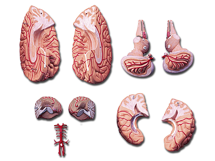 Can be divided into 9 parts showing the temporal and occipital lobes, the frontal and parietal lobes, the cerebellum, the brain stem and basilary artery. All structures, including blood vessels, are shown in great detail. Life size.