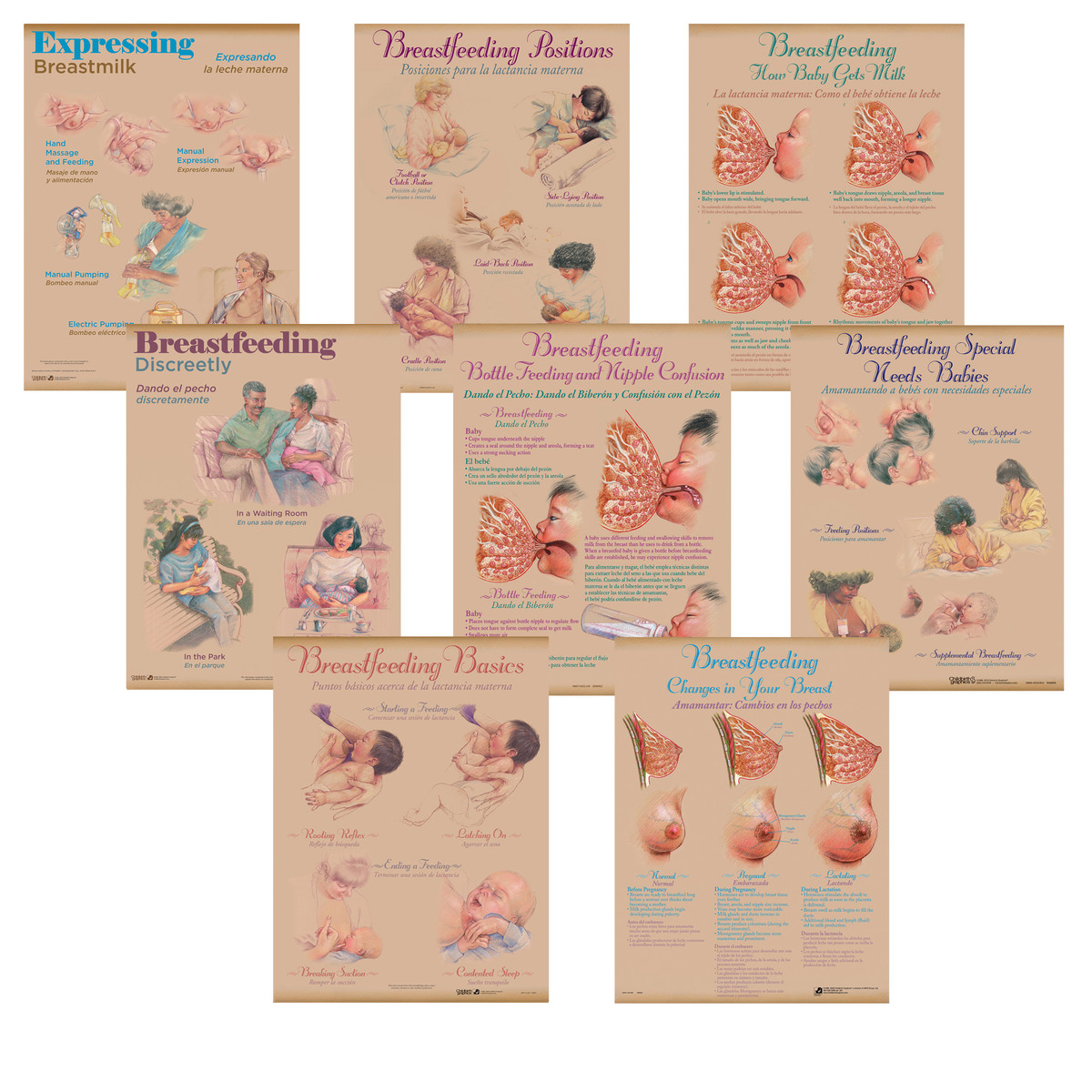 Great for an office, clinic, or post-partum floor, this set of eight laminated, bilingual English/Spanish teaching charts (46 cm x 61 cm) covers breastfeeding basics and solutions to common and special situations.