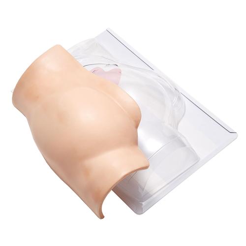 This easy to handle simulator of a human buttock can be fastened like a belt on the body of a student or a training doll. It allows practicing of intra-muscular injections and also the injection of fluid (water) is possible. If the injected part is incorrect, a buzzer, which works with a 9 volt battery and a red light, will give a warning sound. The durable, soft and very realistic skin shows no needle marks even after many exercises.