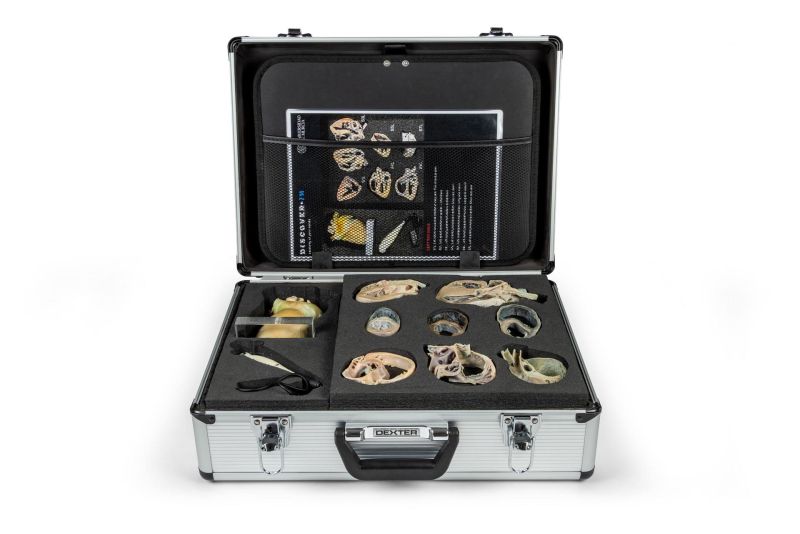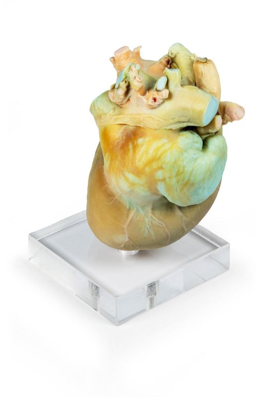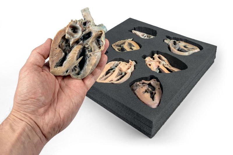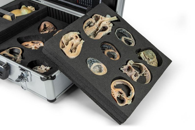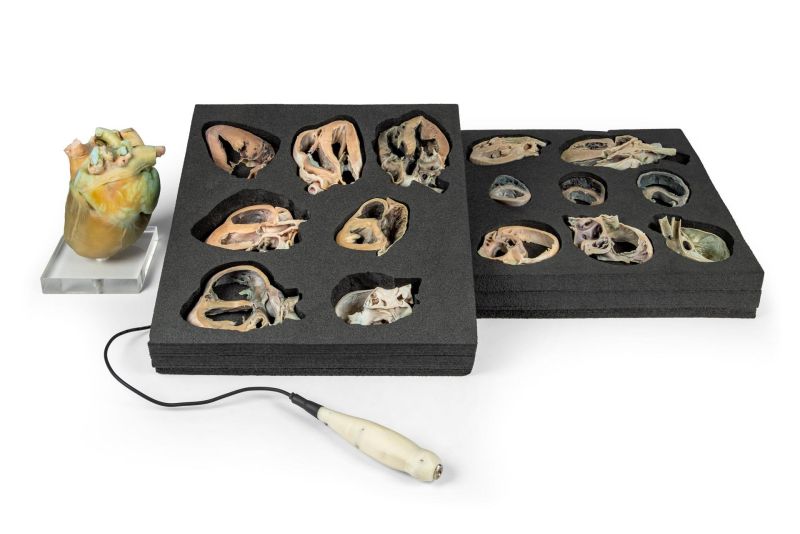 This advanced educational kit features a collection of 15 full-colour 3D-printed canine heart slices. Each model is a precise replica of an original slice, obtained from a real plastinated heart, sectioned according to standard echocardiographic planes, accurately representing the anatomical views captured through ultrasound projections during a cardiac exam. An Innovative Training Tool to simulate clinical practice, the kit includes a 3D-printed ultrasound probe with an integrated laser, enabling users to visualise the orientation and direction of typical echocardiographic projections onto a full heart replica mounted on a pedestal.