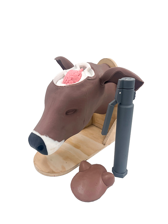 This model supports two types of training. It can be used with the resin artificial skull cap and the practice captive bolt gun, utilizing the light sensor to train the correct precision and angle of the gun. Once the handling of the captive bolt is corrected, the model can be switched out to the clay skull cap model and play-dough brain for practicing firing the real captive bolt gun to assess the position and damage of the brain.