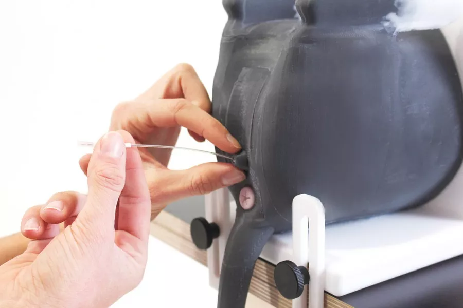 The model can be attached to a desk or table and has non-slip rubber feet to prevent shifting during the procedure.