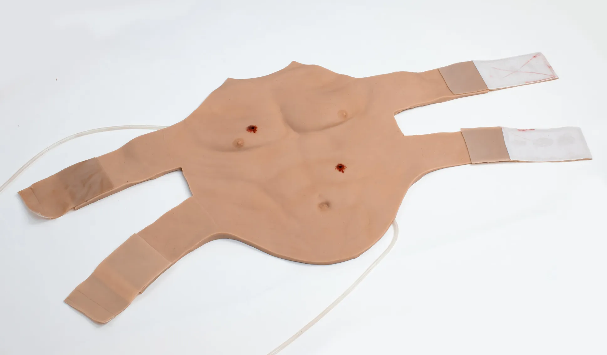 The Gunshot Wound Chest is a realistic wearable training model featuring two entry gunshot wounds, one in the chest and another in the abdomen.