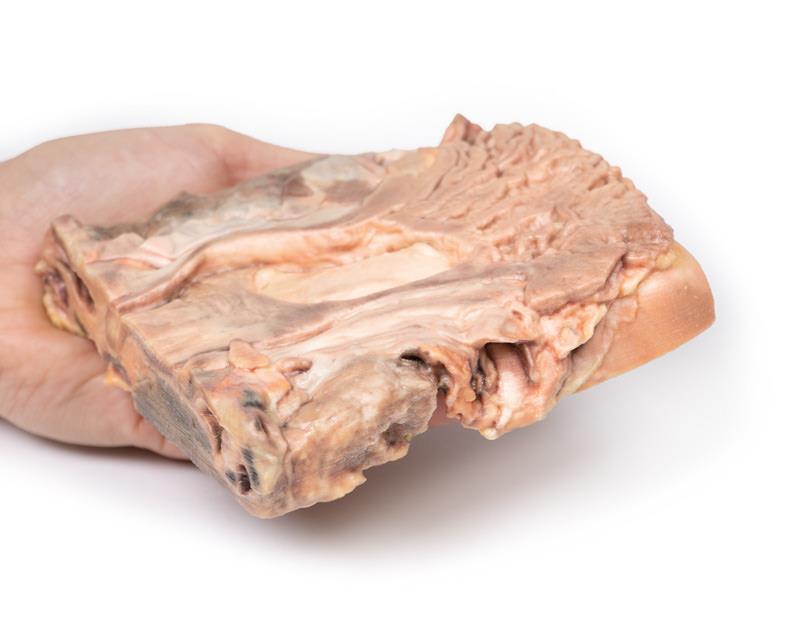 The specimen is a 2cm coronal slice of tissue, which incorporates a portion of stomach diaphragm, liver and pancreas. The specimen has been opened to display a large ulcer at the upper end of the lesser curvature near the gastro-oesophageal junction. Macroscopically, the loss of substance at the site of the ulcer is oval, has 5-6cm in diameter and slightly elevated borders. The base is clean and smooth with no evidence of haemorrhage. The gastric wall surrounding the ulcer is indurated, because of the fibrosis that involves the base of the ulcer and spreads beneath the surrounding mucosa. Being retractile, the fibrosis manages to “pull” the gastric mucosa towards the base of the ulcer, so that gastric mucosal folds converge radially around the loss of substance (this feature is not seen in ulcerated malignant gastric tumours). This is evident on the inferior aspect of the ulcer and less so superiorly.Further Information