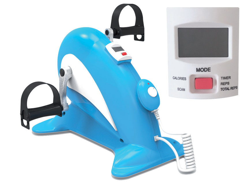 Electronic pedal exerciser with display indicator: scan, mode, calories, time, Reps, total Reps.