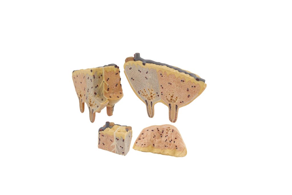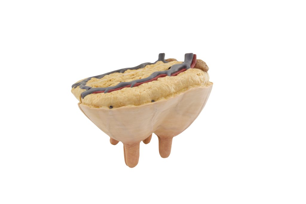 This model is crafted from specialized plastic and is in its natural size. The model consists of 4 parts that enable the examination of the cow’s udder structure through horizontal and vertical sections. These sections reveal arteries, veins, lymphatic vessels, milk ducts, and four glandular regions. It is mounted on a base.