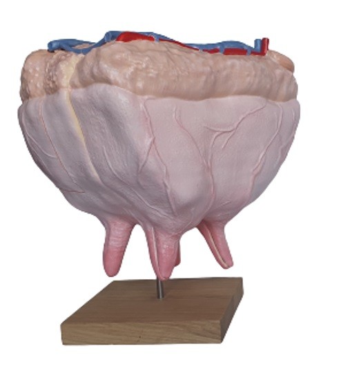 The cow udder model separates into 4 parts in sagittal and vertical section, showing the arteries, veins and milk passages and the four glandular regions. Removable. On a stand with wooden base.
