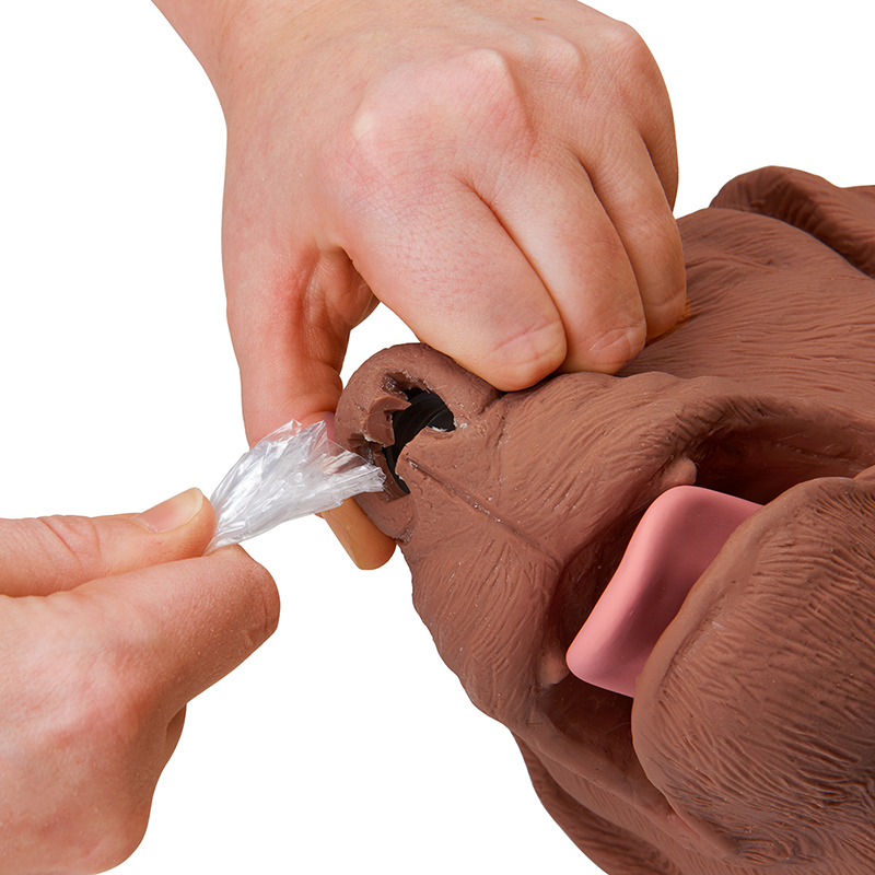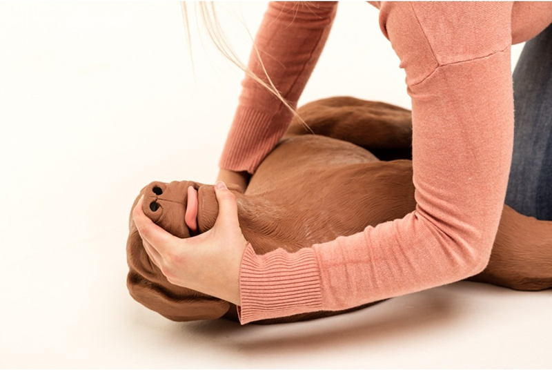 CasPeR the CPR Dog provides training in mouth-to-snout resuscitation with individual-use, disposable airway bags. These economical disposable shield/lung bags eliminate cross contamination between students and the need to disinfect the manikin after every use. This dog manikin can be used to teach proper hand placement for compressions, depth of compressions, airway maintenance, femoral pulse check, and adequate ventilation. The model has no indication function, the teacher has to judge proper exercise. Airways are changed quickly and without tools.