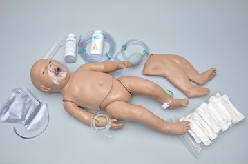 The full-body newborn patient simulator is used to practice and hone the full range of newborn resuscitation skills. Participants can work hands-on and gain clinical competence in proper CPR compressions, fluid infusion, and other airway management skills.