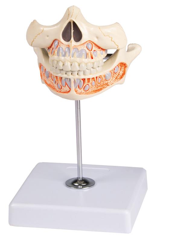 This life size model shows the upper and lower jaw of a 5 year old child. The lower jaw is movable to reproduce the natural chew. The model exposes the arrangement of the young teeth. Mounted on stand.