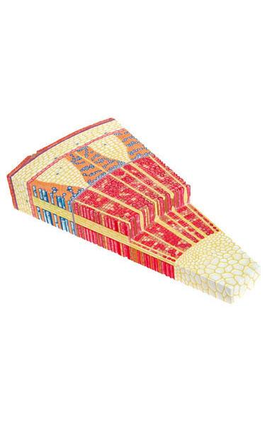 This model, enlarged 300X life size, shows the structure of a dicot wooden stem. Longitudinally and cross sectioned, it shows significant elements of the cortex and central vascular cylinder. All different structures are displayed in different color.