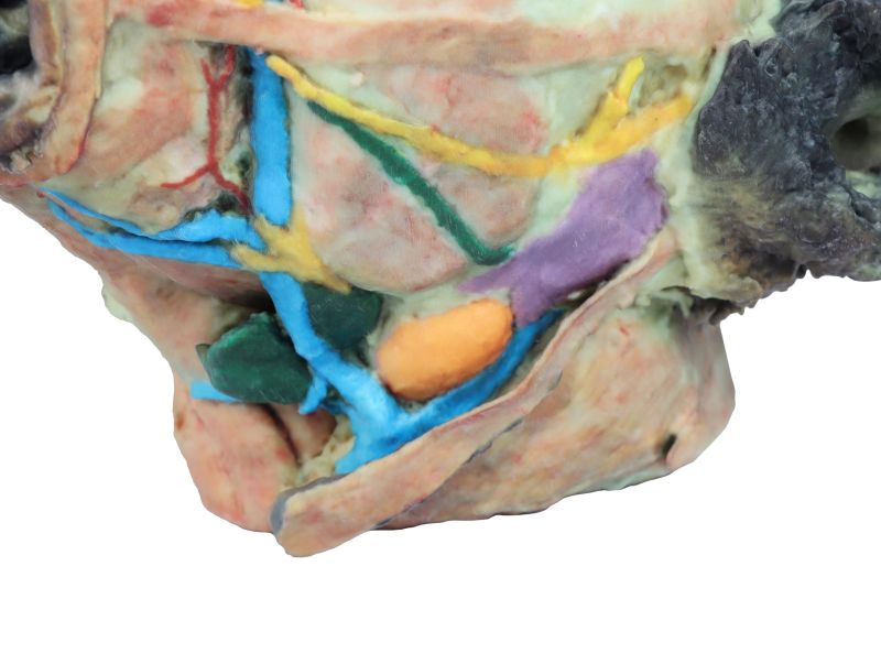 On this right side mandible has been removed to see deeper anatomical structures. You can see the surfaces of the temporal bone for the temporomandibular joint (Articulatio Temporomandibularis). The medial pterygoid muscle (M. pterygoideus medialis) is identified and sectioned in its insertion area to the ramus of the mandible (Ramus mandibulae). Next to this muscle, the branches of the mandibular nerve (N. mandibularis) are identified, as well as the maxillary nerve (nevus maxillaris) and the maxillary artery (arteria maxillaris). Near the external acoustic meatus (Meatus acusticus externus), the facial nerve (N . facialis) has been maintained, with one of its branches,