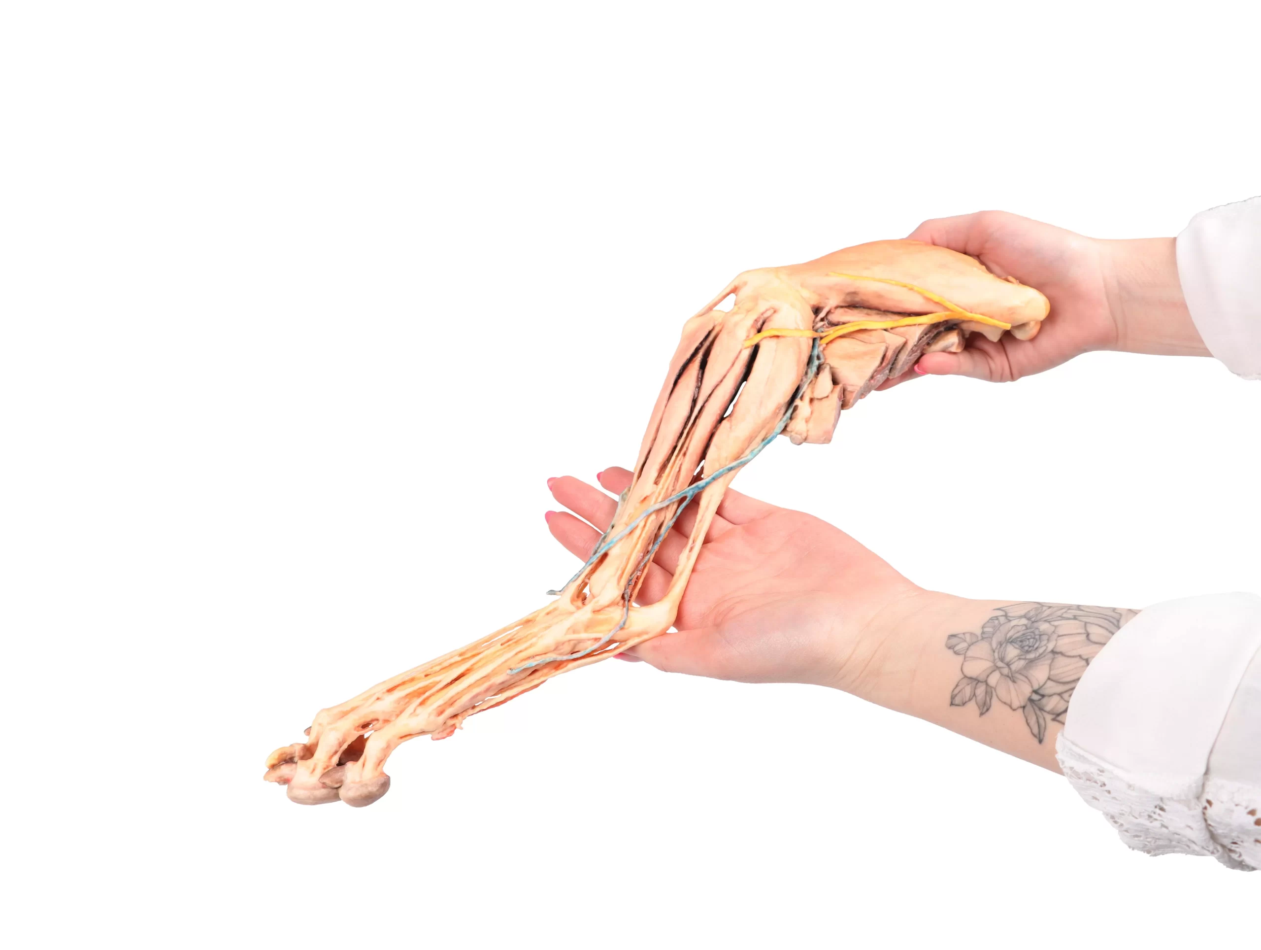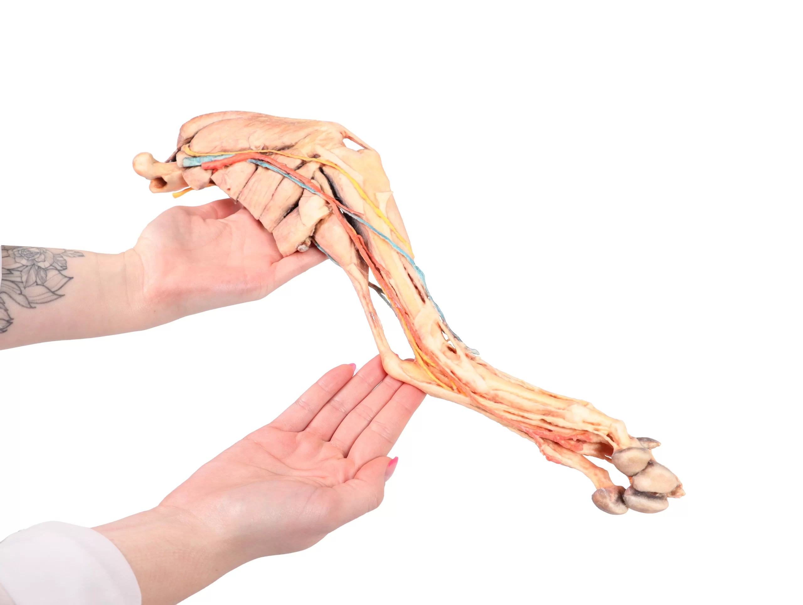 ligaments. Extensor and flexor muscles of the tarsus and fingers are exposed. The dissection preserves the topography of the lateral saphenous vein on the foot surface and caudal aspect of the leg Dorsal and palmar anatomical structures of the foot are dissected. Detailed anatomical description on request.