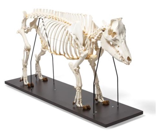 Prepared, real skeleton of an adult domestic pig consisting of approximately 223 individual bones, which are rigidly connected to each other. It is a typical representative of the order of even-toed ungulates. The choice between a female or a male item is available. The skeleton is mounted on a moveable base plate.