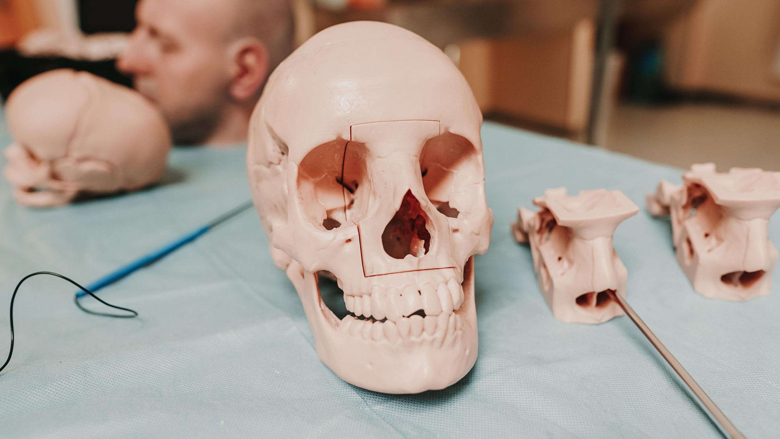 1:1 scaled skull with an interchangeable nasal cube with similar drilling properties to the human bone, dura mater on the innercortical bone and endonasal mucosa. Extraparts available: skin, venous sinuses, arteries, falx & tentorium, brain, cerebellum & brainstem, intracranial aneurysms.
