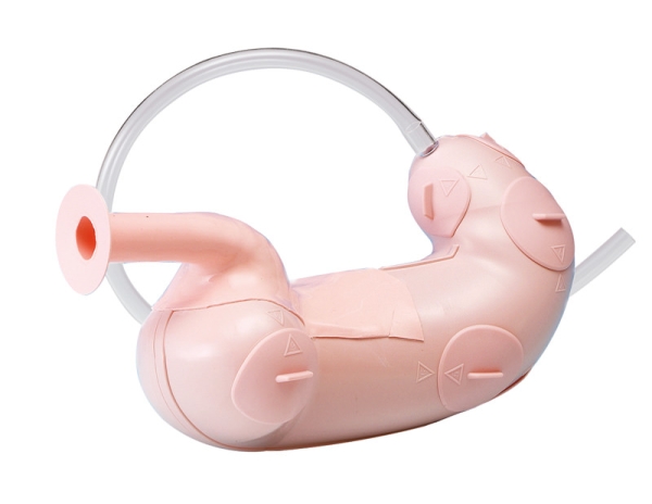 This resinoid model represents almost similar figure of human stomach, and can be used for the training of ESD. Considering the operability of endoscope, the transition part, from esophagus to stomach is made of soft resin. By setting a real dissected stomach of porcine at the area where ESD is supposed to be executed, very similar feeling of human stomach wall can be recognized using endoscope.