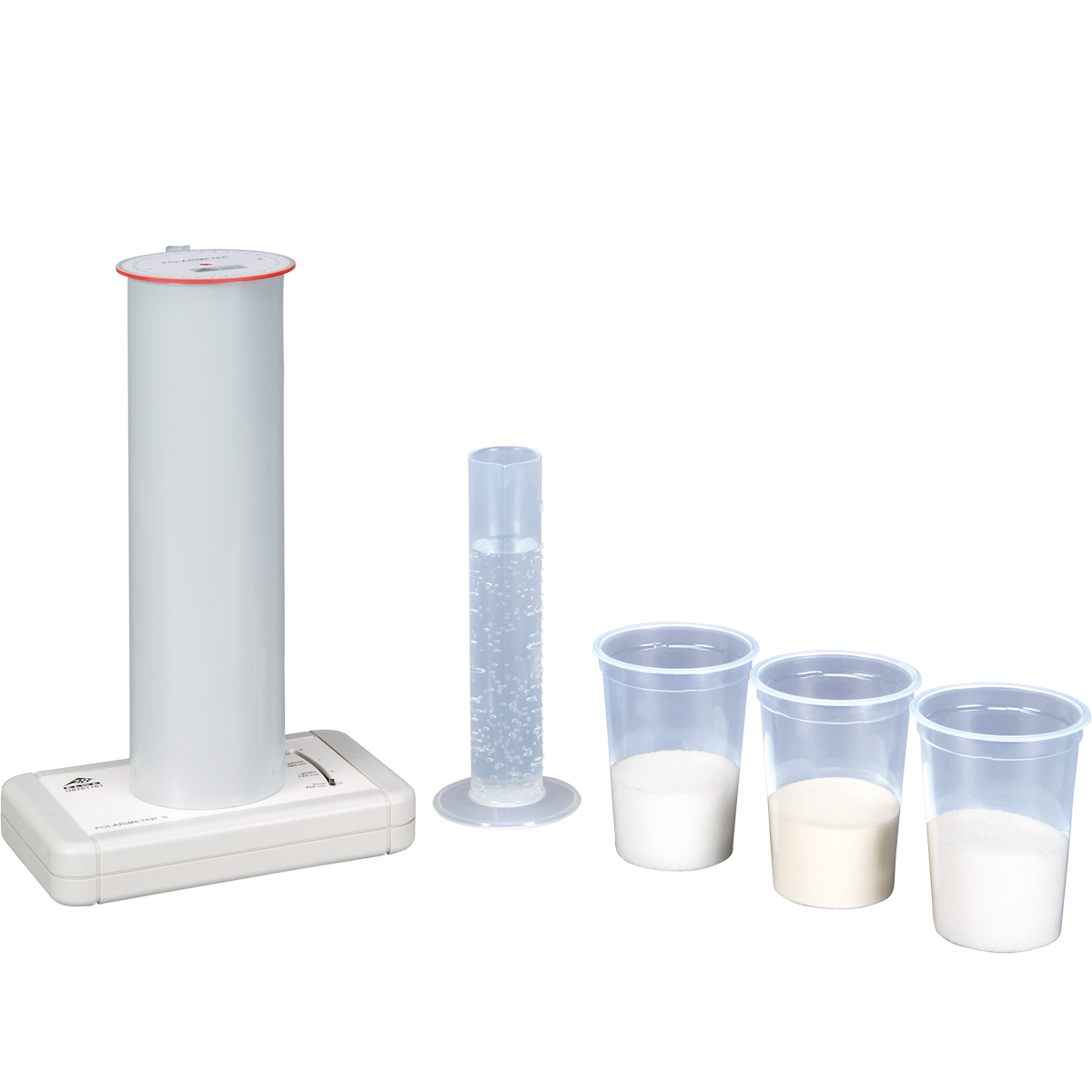 Sugar solutions are optically active, in other words they rotate the plane of polarisation of any linearly polarised light that is passed through them. The direction of rotation depends on the molecular properties of the sugar. Thus, solutions of glucose and saccharose (sucrose) rotate the plane of polarisation to the right (clockwise), whereas fructose solutions rotate it to the left (counter-clockwise), as found when the angle of rotation is measured with a polarimeter. The experiment also includes measuring the angle of rotation to study the behaviour of a saccharose solution when hydrochloric acid is added. This causes a gradual reversal (“inversion”) of the direction of rotation from clockwise to counter-clockwise, as the double-ring structure of the saccharose molecule is split into two, giving an equimolar mixture of glucose and fructose. The angle of rotation of the mixture is the sum of the angles of rotation of the dextro-rotatory glucose and the more strongly laevo-rotatory fructose.