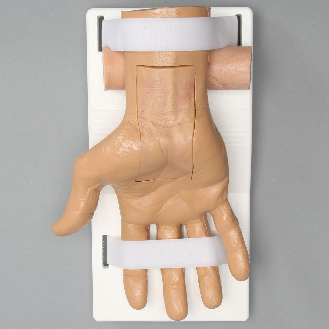 Includes defined built-in flexor ligaments, median and ulna nerve, and artery. Also includes replaceable transverse ligament and transilluminating palmar insert with defined crease and Kaplan’s line. This model includes the base and hyperextension foam cylinder.