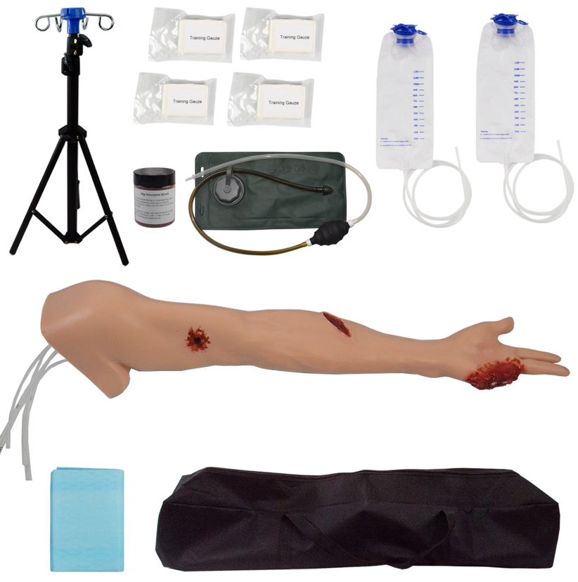 The Hemorrhage Control Arm Trainer is a life-sized adult arm model designed for realistic bleeding control training. It features 5 different wounds for practicing tourniquet application and wound packing, making it ideal for EMT, TCCC, and first aid courses., an all-in-one package bag contains all the training accessories.