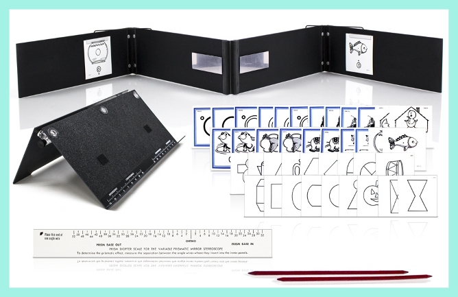 for home vision training during intensive therapy and for retention therapy – it is a stereoscope, a true space fusion trainer and by changing the configuration, instrument serves as a single oblique mirror stereoscope or cheiroscope