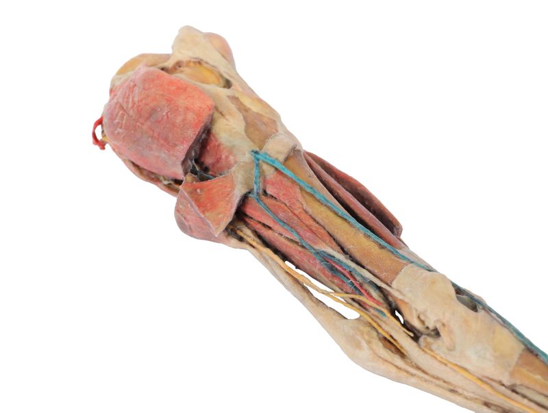 This specimen preserves a superficial dissection of the lower limb musculature from the midthigh to the hoof. The capsule of the stifle and tarsus joints has been opened to demonstrate the menisci, the main ligaments and the topography of the tendons. Muscles extensor and flexor of these joints as well as the foot joints have been dissected from the origin in the femur and tibia bones, to the insertions tendons in the tarsus, metatarsus and phalanges bones. Nerves and vessels have been dissected in the popliteal fossa, tarsus and digit regions. Detailed anatomical description on request.