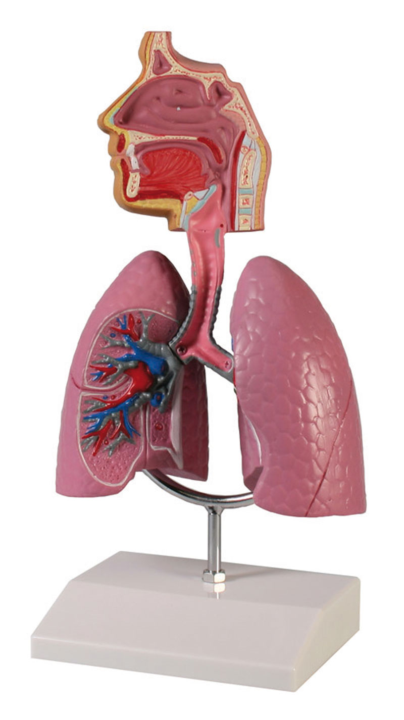 Representation of the human respiratory system in about half life size. Lungs, trachea and upper respiratory tract are shown in detail. The model comes on a removable stand.