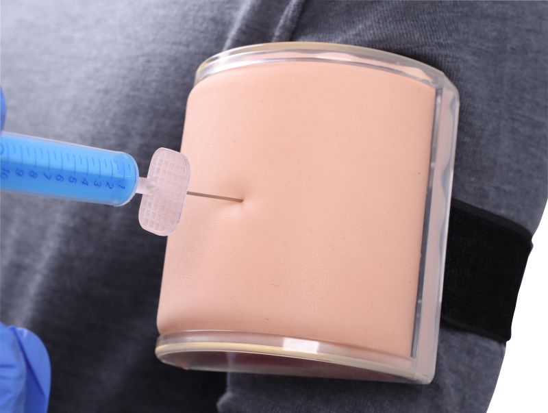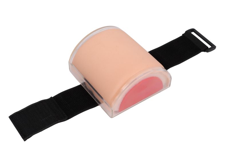 This injection pad can be used both as a table model and for strapping to the arm, leg or other parts of the body. It makes it possible to learn and train intramscular and subcutaneous injections. The pad has 3 skin layers, epidermis, fat layer and muscle layer. It is possible to inject fluid, which can simply be squeezed out after the exercise. The pad can be easily strapped on and taken off again using the Velcro strap. Size 12x12x8cm, weight 0.4kg