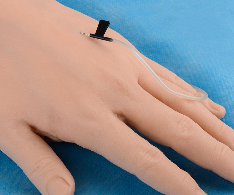 This life-size hand has a venous system that is filled with blood via tubes. The veins can be palpated and punctured, making it possible to learn and practise intravenous access. The model can be punctured many times before it needs to be replaced. Supplied complete with tubing system and blood supply. Size 30x11xm, weight 0.4kg