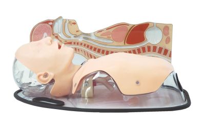 The Tube Feeding Simulator is an effective training tool for caregivers of patients with enteral tube nutrition as well as medical professionals. The manikin has three routes for EN tubes and allows training with real liquid foods. To facilitate anatomical understanding, the feeding routes panel for demonstration and the chest anatomy to overlay the manikin come with the set. The placement of the tubes can be confirmed by auscultation as well as direct observation. This simulator is compact and portable. The neck is flexible to learn appropriate neck/head positioning. Oral/Nasal feeding tube insertion and PEG tube setting is possible. Tube placement can be confirmed by auscultation. The transparent structure allows direct observation of progress and placement of the tube. The manikin can be set at Fowler‘s position. Real liquid foods (formulas) can be administrated. The tube feeding routes panel and the chest sheet facilitate demonstration and anatomical understanding
