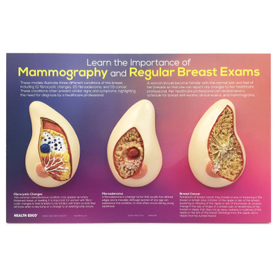 The handpainted, 3-D breast models on this display (43 cm x 28 cm) feature the anatomy of three different breast conditions. Breasts with fibrocystic changes, a fibroadenoma, and a malignant tumour are depicted, reinforcing the importance of breast exams and mammography. Great for raising awareness about the early detection of breast cancer.