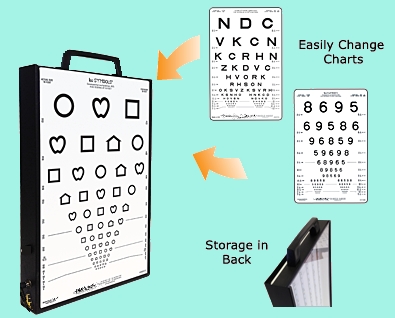 the small cabinet uses LEDs to illuminate the panel and offers uniform lighting across the chart face – for high contrast vision testing and contrast charts – this small illuminator cabinet is portable and easy to use and provides the ability of testing in many different environments – LED cabinet is great for testing distances ranging from 40 cm to 4 meters – it can be wall mounted or used with a table stand – chart pocket in rear to hold charts when not in use – sold without charts – measure 38x27x3cm and weighs 3.5Kg – input 24V