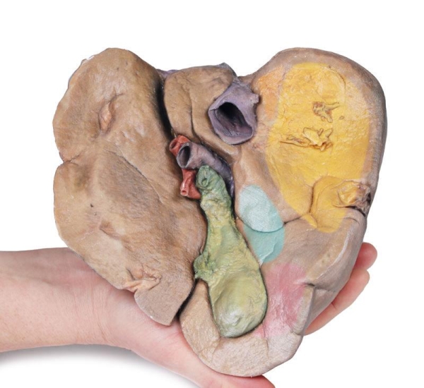The size and shape of this specimen varies somewhat from a typical liver. It is less wedge-shaped and longer in the superoinferior dimension (on the posterior view this would translate to a greater vertical height). Normally, a liver is less than 16cm in the midclavicular line.1 This specimen measures approximately 18cm in the midclavicular line, suggesting some degree of hepatomegaly. However, it is worth mentioning that some measurement distortion may have occurred based on the fixing and curation of the specimen – and it must be noted that the accuracy of estimating liver size using a single parameter is limited. Liver measurements diagnostic of hepatomegaly vary depending on normal anatomical variation in liver size and morphology, the method of measurement, and patient features such as sex and BMI.