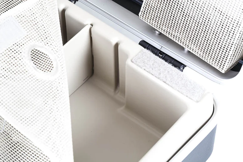A bottom insert (with variable compartment division by means of a stable plastic plug-in slide system), grid cover plates with Velcro fasteners for both sides of the case bottom to secure the contents are included