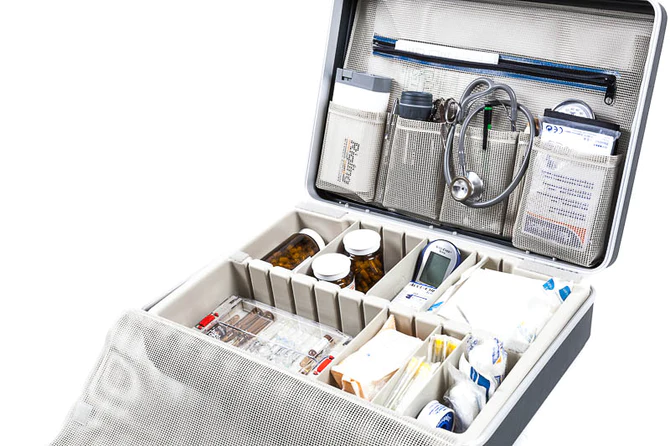 The hard case with a precisely fitting aluminium profile frame offers the best protection for the contents even under the toughest conditions. As a doctor’s case, it convinces with its flexible compartment division.