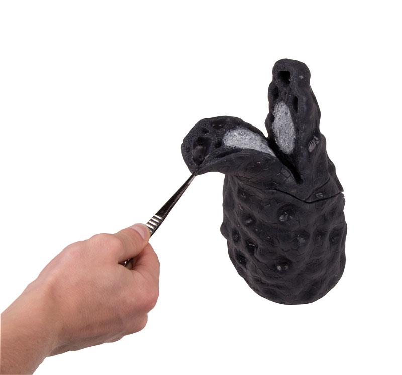 This impressive model shows the left lung half of a smoker. The model can be opened and shows a greyish-white, fibrous-feeling cancer. A model for real dramatically demonstration!