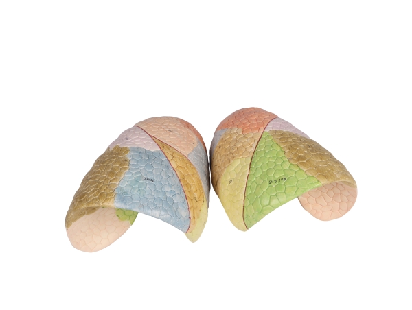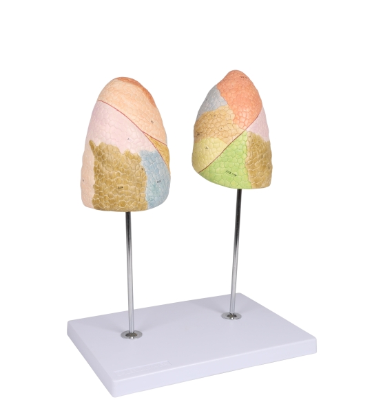 This life size model shows clearly the segmental anatomy of the left and the right lungs. The various lobes are painted with different colors to highlight their locations.
