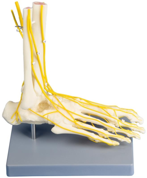 Life size model of the right foot with all major nerves depicted, shown on both dorsal and plantar surfaces. Foot can be removed and placed on the stand upside down to facilitate viewing of the plantar surface. Mounted on a stand with keycard.