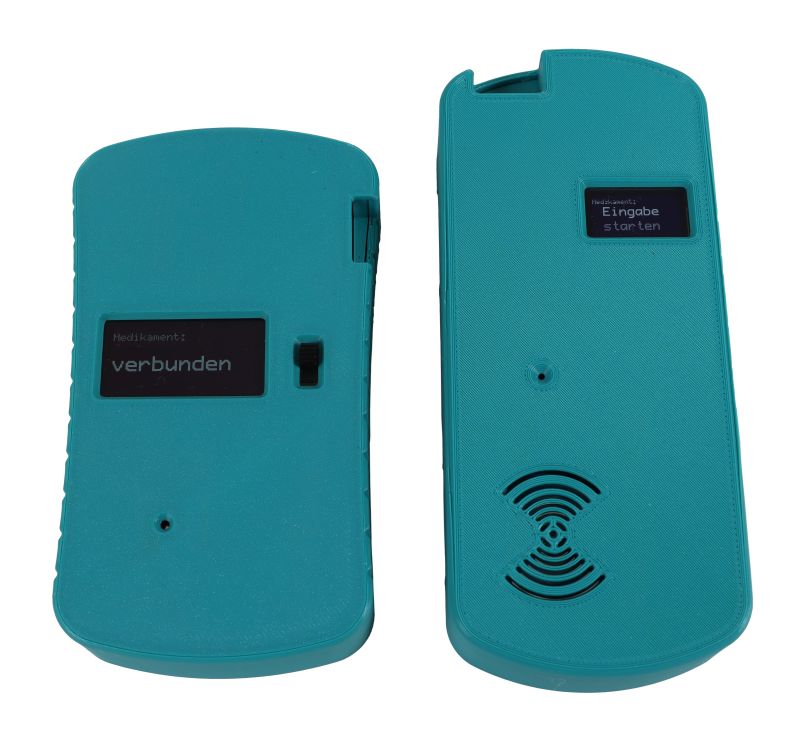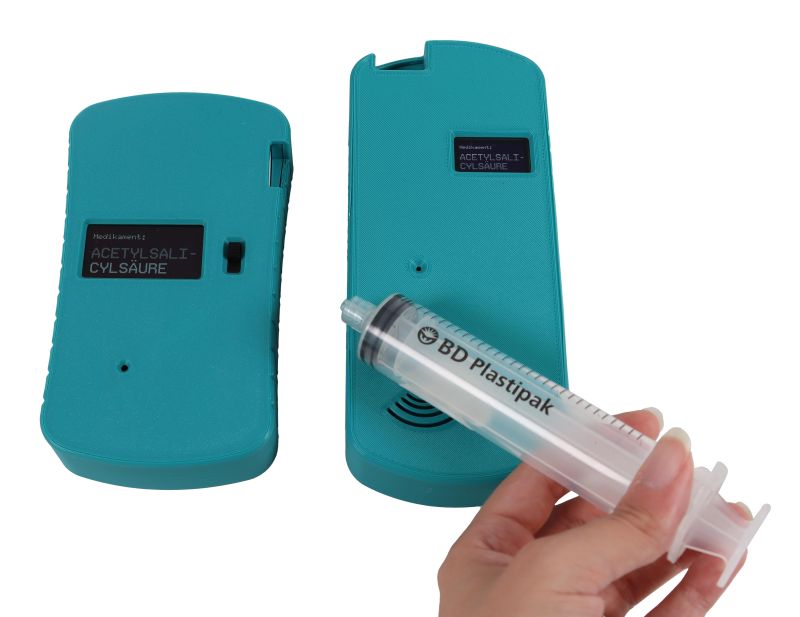 This electronic system, when strapped to the arm of an actor or puppet, allows the wireless recognition of up to 50 medications. The name of the medication is displayed on the device and simultaneously transmitted wirelessly to the tutor‘s display. Ideal if the tutor is sitting in a monitoring room and cannot see the medication directly.