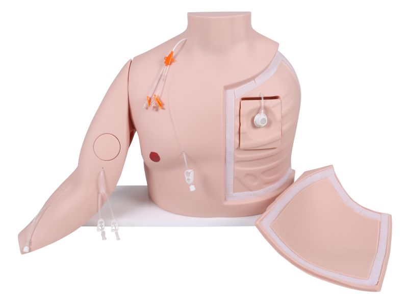 Vascular Victor has both an implanted port system (central venous catheter) and an implanted peripheral port in the upper arm. Both ports are functional exercise ports. Vascular Victor also has a 3-lumen CVC, which can be inserted either into an opening in the subclavian vein or into an opening in the jugular vein, as well as a tunneled CVC. A PICC in the basilic vein and an IV access on the forearm are available on the arm.