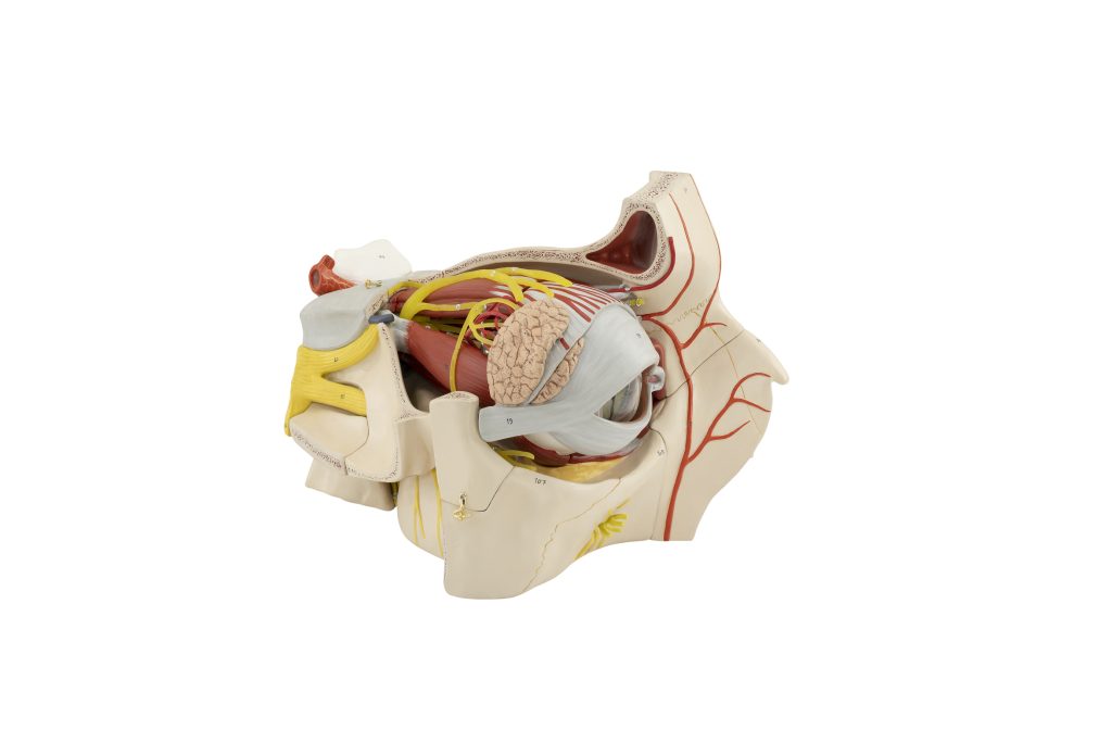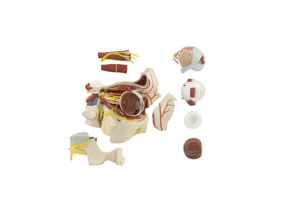 This model is 5 times larger than its natural size. It can be disassembled into 9 parts. The model displays all six eye muscles. All essential nerves and blood vessels have been depicted. Superior rectus and lateral muscles can be removed. The orbital process of the frontal bone and the lesser wing of the sphenoid bone have been removed to provide a clear view of the orbit. The median section of the eye (with the lens fixed in the left half), the vitreous humor, the right half of the sclera, and the choroid layer along with the retina can be removed. The model also features visible lacrimal organs along with the eyelids. Both the major and minor palatine nerves are visible. The pterygopalatine ganglion is replicated to match its natural structure. The frontal sinus and pterygopalatine fossa cavities are included to match their natural structure. The model is mounted on a base.