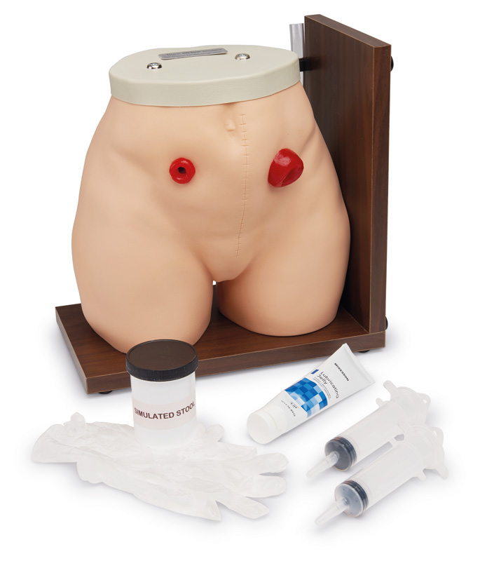 Reproduction of an abdomen showing the anatomy of both a colostomy and ileostomy to provide lifelike functions and appearance. Dilation of the stomas can be demonstrated and practiced, along with application of postoperative and permanent ostomy bags. The colostomy can be irrigated. Drainage and excretion at the ileostomy (water) and colostomy (simulated stool) can be pumped by syringes. Delivered with simulated stool and carrying case.