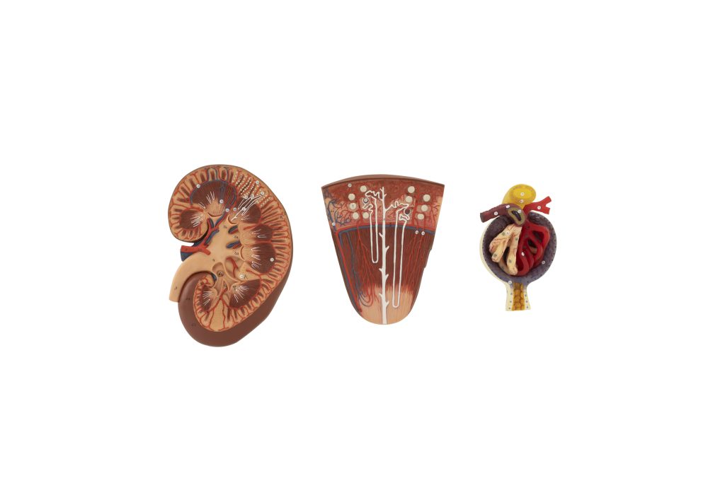 This model, made from specialized plastic, features an enlarged kidney section that is approximately three times its natural size. It also includes a magnified nephron at 120 times its actual size and a glomerulus at 700 times its actual size, all presented on the same board. The right kidney section depicts the renal pyramids and the portions of papillae entering the pelvis, along with the schematic representation of the nephron, including Henle’s loop. In the nephron section, it shows the renal corpuscles, renal tubules, and collecting ducts of two nephrons. The magnified glomerulus highlights the afferent and efferent arterioles, glomerular capillaries, urinary pole, and Bowman’s capsule.
