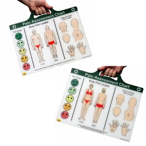 The Find Pain Assessment Chart is designed to help people communicate when their communicative abilities have become impaired, with clear, simple-to-understand graphics, the subject can express the location and severity of their discomfort quickly and easily. The Pain Assessment Chart displays both male and female graphics and is manufactured in a non-reflective, robust, hygienic plastic.