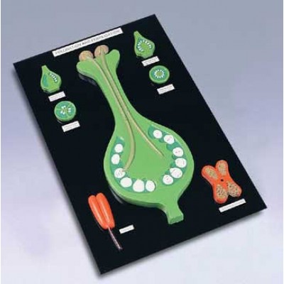 The main model is a vertical section through the stigma, style and ovary, showing the growth of the pollen tubes to the ovules. Separate models show anther, anther dehiscing, and different types of ovary in transverse and longitudinal section. Base size 50x33cm.