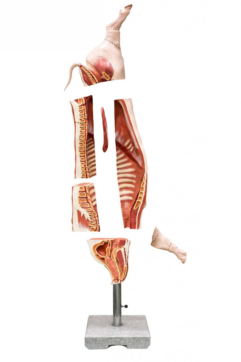 A natural size model showing a pork half-carcass on a base that ensures the stabilization of the model. The individual parts of the model are divided according to the DLG classification – “simplified DLG cutting method”. The model is divided into 7 parts such as: