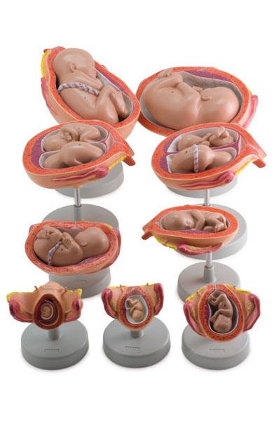 This model, composed of 9 life-size pieces, illustrates human foetal development from the 4th week to the 6th month. All the main structures of the uterus and foetus are well represented and identified on the accompnying k-card. Two models of the set show the different position of twins.